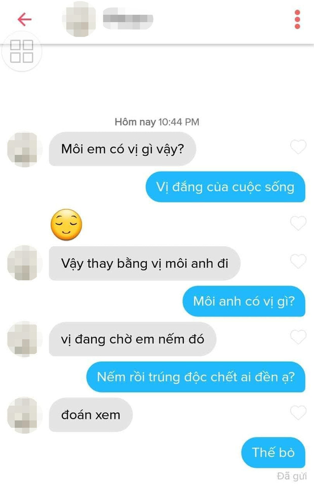 26/04/2020 22:40Thanh niên lên Tinder gặp gái nào cũng hỏi 'Môi em có vị gì vậy?' liền nhận lại loạt đáp trả bén như cái chén