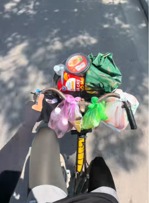 Quang Hà cũng hào hứng khoe những nhu yếu phẩm được những người yêu quý gửi tặng trên đường đi. Cậu bạn bỏ tất cả vào giỏ xe vẫn không đủ chỗ, chàng trai 24 tuổi đành bỏ trong túi bóng, treo lên cả tay lái… mà vẫn chật kín. Zoom kỹ và quan sát một hồi lâu thì vẫn khó đếm được trên giỏ xe của anh chàng có bao nhiêu bánh mì, mì tôm, nước lọc,... vì chật kín. Đủ thấy tình cảm của mọi người dành cho Quang Hà nhiều thế nào!