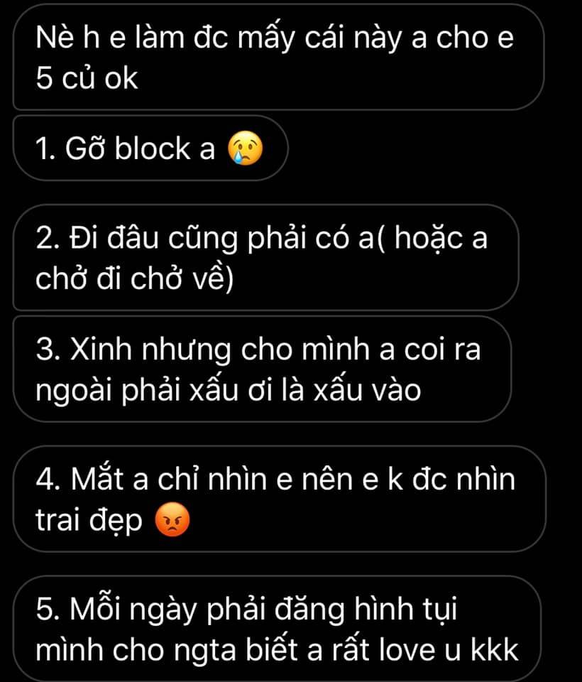 Mới đây, trên MXH đã xuất hiện một bài đăng chụp đoạn tin nhắn của một cặp đôi. Nhân vật nữ không rõ vì lý do gì nhưng đã block tài khoản của người yêu. Và anh trai này trong lúc năn nỉ nửa kia của mình, đã đề nghị đưa cho cô 5 triệu, đổi lại, cô gái sẽ phải làm theo những yêu cầu của anh ta như gỡ block, đi đâu cũng phải có mặt anh ta. Một số trong đó khá quá đáng như đi ra ngoài phải xấu xí, mỗi ngày đều phải đăng hình chung trên MXH để thiên hạ biết họ đang yêu nhau...