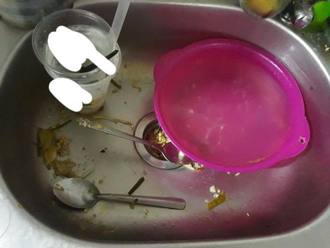 "Chưa kể đến đồ ăn thừa toàn để có dòi mới đi vứt. Còn nguyên chiếc bồn rửa chén thì toàn là chén bát của bạn đó để khi nào bốc mùi mới rửa. Lúc rửa còn than vãn là "sao gớm thế nhỉ, chắc phải rửa bằng nước sôi mới ăn lại được". Nhiều khi thấy quá bừa bộn mình có dọn đồ của bạn ấy cho gọn gàng lại, tuy nhiên bạn đó vẫn thản nhiên ngồi một chỗ chẳng nói năng gì, cũng chẳng đứng dậy dọn phụ giúp", L.N ngán ngẩm.