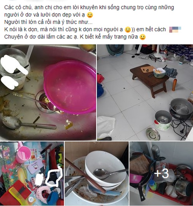 Đi kèm theo loạt ảnh chụp lại hiện trường, L.N bức xúc: "Các cô chú, anh chị em cho em lời khuyên khi sống chung trọ cùng những người ở dơ và lười dọn dẹp với ạ. Người thì lớn cả rồi mà ý thức thì rất chi là ba chấm. Không nói là không dọn mà nói cũng không dọn mọi người ạ. Em hết cách rồi".