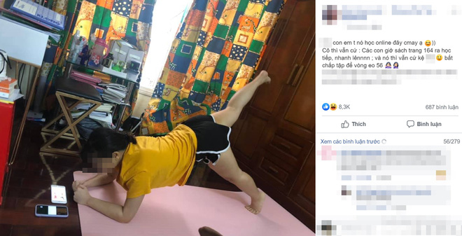 "Em mình học online đây. Cô thì cứ: "Các con giờ trang sách 164 ra đọc tiếp, nhanh lên", và nó thì vẫn kệ, bất chấp tập để vòng eo 56".