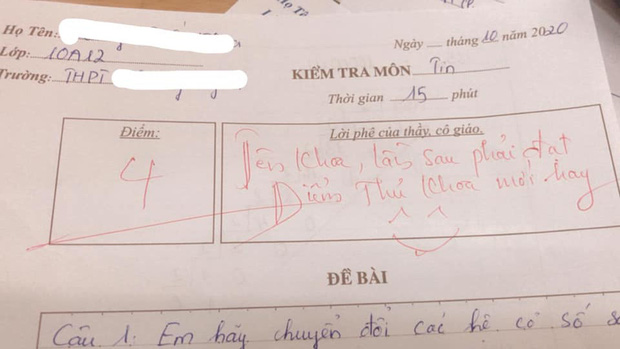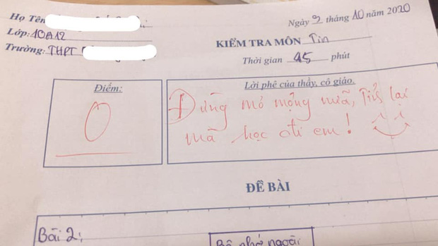 Ngày nay, thầy cô có vẻ hiện đại và gần gũi với học sinh hơn rất nhiều nên ngoài những lúc nghiêm khắc, họ còn có những giấy phút cực kỳ đáng yêu mà có muốn giận cũng không giận được, chẳng hạn như giáo viên dưới đây. Theo đó, các học sinh lớp 10 của 1 ngôi trường tại Hà Nội được yêu cầu làm bài kiểm tra Tin học 15 phút. Đây là môn học khiến bao thế hệ học sinh toát mồ hôi vì độ siêu khó. Do đó, sau khi phát bài, nhiều học sinh của lớp học này phải nhận về số điểm không mấy khả quan.