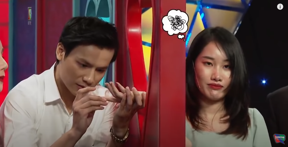 Xem xét kĩ từng ngón tay của đàng gái, Đại Thành quay ra gật gù "phán": "Ở hai ngón cái của bạn chủng vân tay hình nước. Tính cách của bạn có xu hướng xuôi dòng với cuộc sống. Ví dụ khi rơi vào hoàn cảnh nào đó cũng dễ thích nghi, hòa đồng.