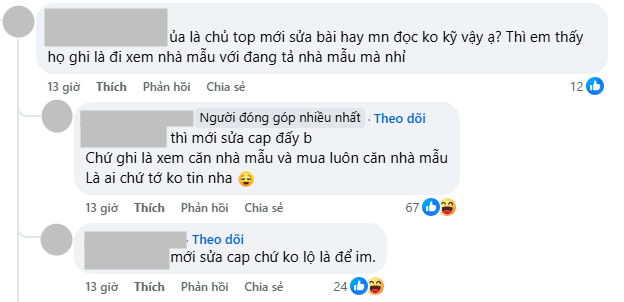 “Sao admin vẫn còn duyệt mấy bài như này nhỉ? Ad ơi, thanh lọc nhóm đi ạ”, “Coi thường người xem quá”, “Những thứ lấp lánh thường làm ta loá mắt”, “Mình đổi tên nhóm thành *Nghiện nhà sẽ mua* cho logic có được không ạ?”, “Nhà mẫu nhưng viết tưởng thật luôn”, “Bao giờ là nhà của mình thì chụp rồi up chứ đi thăm căn hộ mẫu xong chụp up lên nhóm Nghiện Nhà làm gì hả chị ơi”,...
