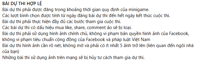 Ở tiêu chuẩn bài dự thi hợp lệ, ngoài những quy định về cách thức, BTC đưa ra yêu cầu về hình ảnh: sử dụng hình ảnh chính chủ, không vi phạm bản quyền hình ảnh và tiêu chuẩn cộng đồng của nền tảng; ảnh rõ nét, không mờ và phải có ít nhất 5 ảnh trở lên (liên quan đến ngôi nhà của bạn).