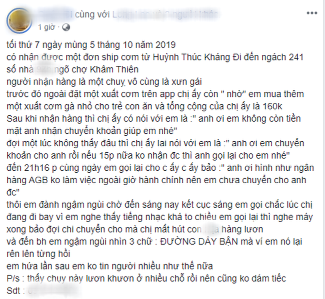 Nguyên văn dòng tâm sự, tài xế Grab bức xúc kể lại: "Tối thứ 7 ngày mùng 5 tháng 10 năm 2019. Em có nhận được một đơn ship cơm từ Huỳnh Thúc Kháng đi đến ngách 241 số nhà ***, ngõ chợ Khâm Thiên. Người nhận hàng là một chị rất xinh gái.