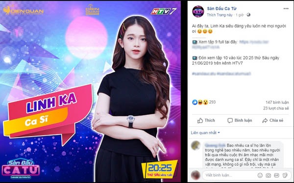 Mới đây, trên trang facebook của chương trình Săn đấu ca từ có đăng một poster giới thiệu khách mời trong tập tiếp theo. Điểm đáng chú ý của poster này là gọi Linh Ka là ca sĩ.