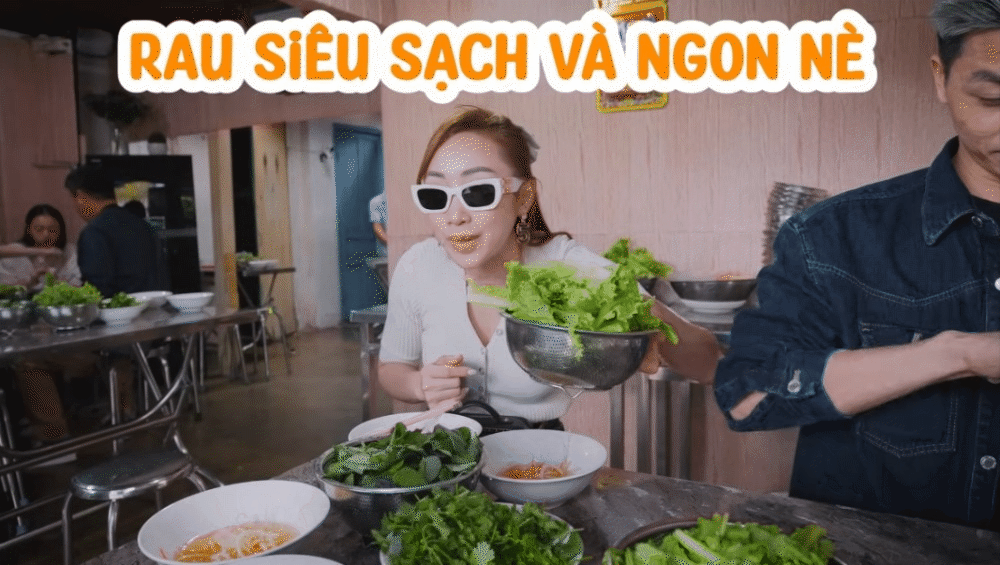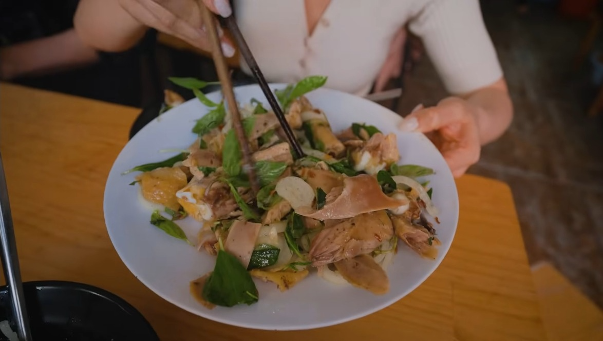 Món tiếp theo chính là bánh ướt lòng gà, gỏi gà, mọi người có thể ăn hai món này vào buổi sáng như Thùy Chang. Ở Đà Lạt có rất nhiều quán bánh ướt lòng gà, riêng quán mà "phú bà quận 2" lựa chọn lại ở sâu trong một con ngõ nhỏ.