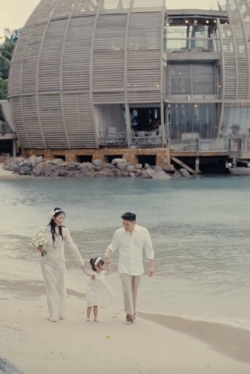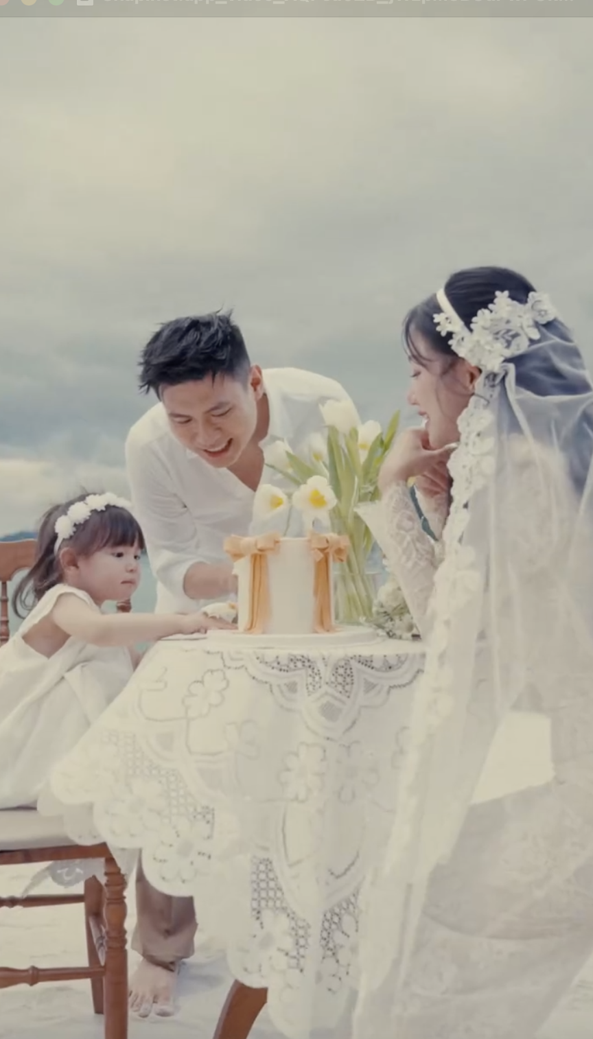 Nhiều người cho rằng, bé Pam sẽ rất vui và hạnh phúc khi được góp mặt trong ngày vui của bố mẹ. Khung cả 3 người trên biển hay cùng trong một bàn trà được netizen bình chọn là “lụy” nhất vì tạo được không khí ấm áp, vui vẻ của gia đình nhỏ.