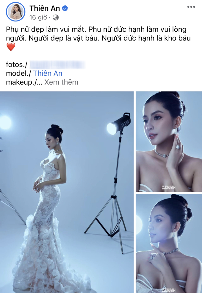 Như mới đây, khi Thiên An đăng một bức ảnh với bộ đầm trắng được thiết kế xuyên thấu, ôm theo từng đường nét cơ thể của cô đã khiến dân tình xuýt xoa không ngớt. Đi kèm bộ ảnh là caption của Thiên An: "Phụ nữ đẹp làm vui mắt. Phụ nữ đức hạnh làm vui lòng người. Người đẹp là vật báu. Người đức hạnh là kho báu".
