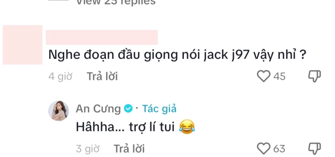 Cụ thể, cô khẳng định rõ ràng đoạn clip là chỉ có cô và các thành viên trong ekip, và người có giọng nói bị cho là giống Jack chính là trợ lý của mình. Thiên An đáp trả với thái độ vẫn vô cùng thân thiện và đây là một trong những lần hiếm hoi cô giữ thái độ vui vẻ bình thường khi nhắc đến chồng cũ.