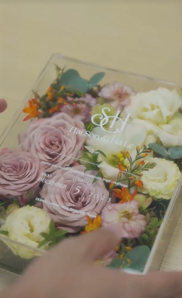 Chia sẻ về chuyện này, Hà Lê cho biết: “Chúng mình thấy đấy không phải phung phí. Đây chỉ là thiệp cho private wedding - bữa tiệc nhỏ thân mật dành cho anh em bạn bè thân thiết. Từ khi lên ý tưởng cho chiếc thiệp hoa này, chúng mình đã muốn đó là món quà kỷ niệm cho mọi người để cảm ơn mọi người đã đồng hành cùng bọn mình”.