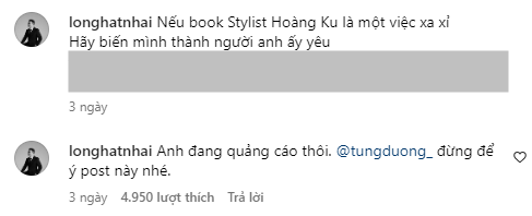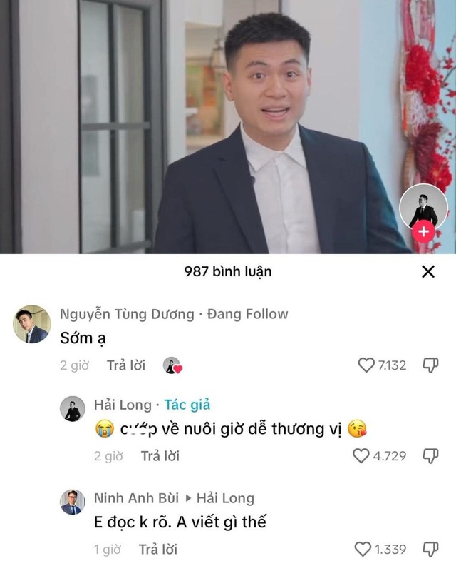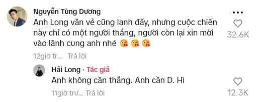 Phía dưới clip, Tùng Dương - nhân vật được nhắc trong đoạn clip này, anh chàng cũng có mặt và để lại bình luận: “Anh Long văn vẻ cũng lanh đấy, nhưng cuộc chiến này chỉ có một người thắng, người còn lại xin mời vào lãnh cung anh nhé”. Tuy nhiên, đáp lại comment này, Hải Long tiếp tục chèn cụm "Anh cần D (D viết tắt của từ Dương), tiếp tục đẩy trò đùa đi xa.