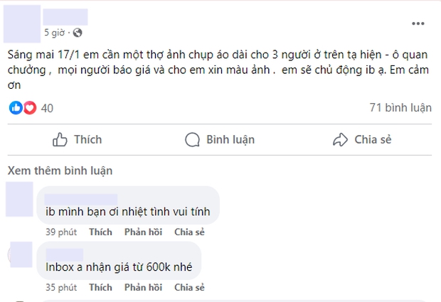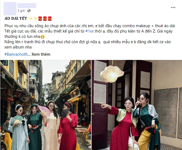 Chỉ cần search từ khoá ''chụp ảnh áo dài'' sẽ thấy các bài đăng rần rần trong nhiều hội nhóm. Đa phần đều xuất phát từ nhu cầu chụp ảnh của khách hàng, mọi người sẽ đăng bài hỏi tìm thợ chụp, hỏi địa điểm thuê trang phục,... Phía dưới đó có tới hàng trăm bình luận, vào ''flex'' sản phẩm, mức chi phí khác nhau từ giá ''học sinh sinh viên'' đến những bộ hình chuyên nghiệp, đầu tư concept cầu kỳ đều có đủ.