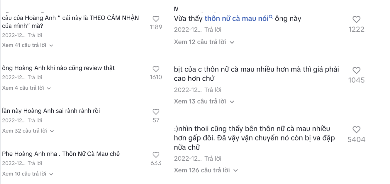 Một vài người ủng hộ cô nàng nhưng số đông lại không thích cách cô nàng cạnh khoé những review chê sản phẩm bị mặn, đóng gói sơ sài, dù các TikToker trên đã cảnh báo dựa theo khẩu vị cá nhân. Các bên liên tục lời qua tiếng lại suốt một khoảng thời gian dài, cộng đồng mạng theo đó lại chia thành 2 phía đối lập: phía ủng hộ các reviewer phản ánh chất lượng và phía ủng hộ Thôn Nữ Cà Mau bảo vệ sản phẩm của mình.