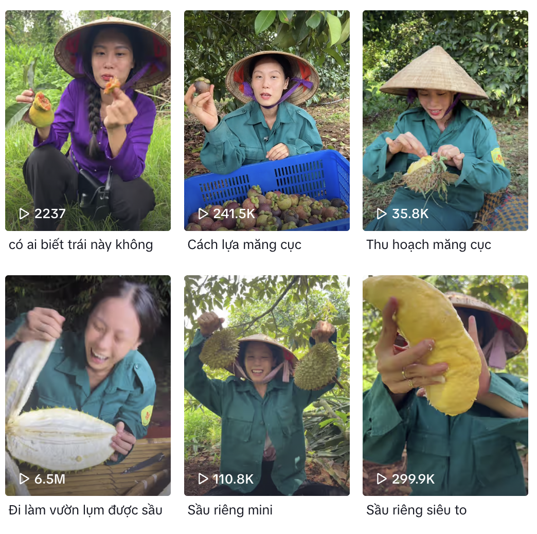 Ngoài ra, cô nàng cũng đăng tải nhiều video thu hoạch và lựa chọn một loại trái cây cũng đang được mùa khác là măng cụt. Xen kẽ là những video khoe các trái sầu riêng có múi siêu to khổng lồ, đúng chuẩn hàng bán cho khách nhưng lại không được thu hút nhiều bằng những nội dung gây tranh cãi trên.