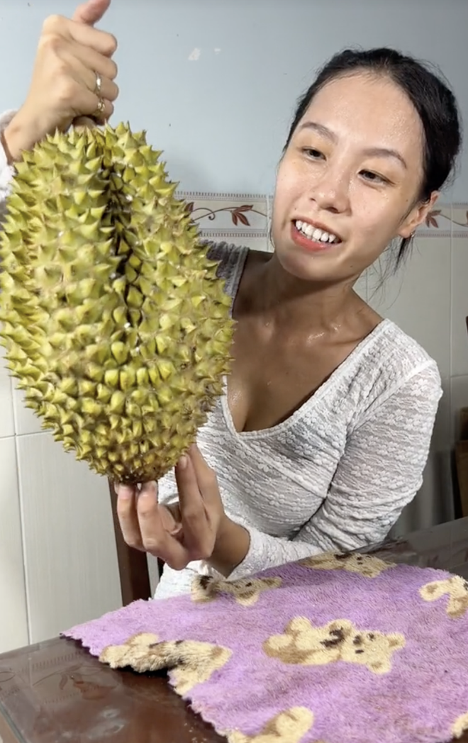 Trong đó, video xẻ trái sầu riêng mà theo cô nói là "Xin mẹ 200 ngàn để mua trái này" thu hút hơn tất cả. Nguyên nhân là vì trái sầu riêng này mà có giá lên đến 200 nghìn đồng thì quá là vô lý, vì trái 5kg mà lượng vỏ đã chiếm đến 4kg, chỉ thấy đúng 1kg thịt sầu. Nhiều người còn cho rằng như vậy chẳng khác gì bỏ tiền để mua vỏ sầu riêng, hoặc mua trúng sầu riêng "chín bòi".