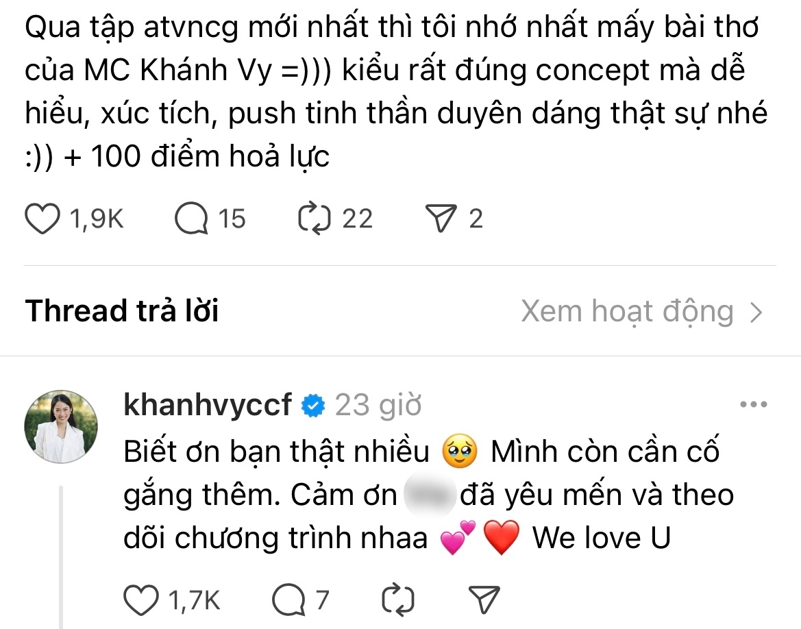 Khánh Vy chưa lên tiếng về những ý kiến chê bai mình trong show. Tuy nhiên, khi có một fan khen Khánh Vy khi đã dành được những bài thơ xúc động tặng cho các anh, nữ MC khiêm tốn trả lời: "Biết ơn bạn thật nhiều. Mình còn cần cố gắng thêm".