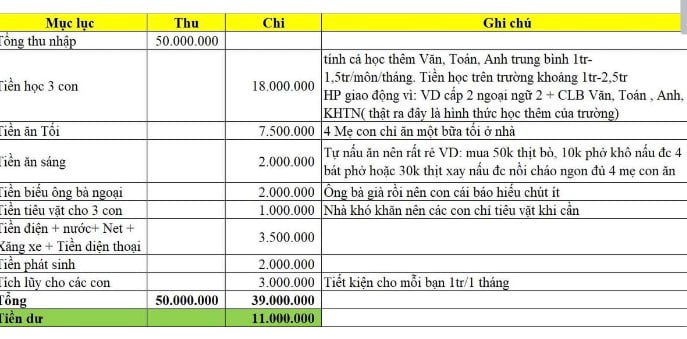 Theo đó, câu chuyện mà chị C gửi trong nhóm về chi tiêu thông minh, quản lý tài chính cá nhân hiệu quả như sau: Chị C hiện đang nuôi ba đứa con: một bé lớn học lớp 11 và hai bé nhỏ đang theo học cấp 2. Gia đình chị đang ở nhờ nhà ông bà ngoại với các mức chi cơ bản như sau: