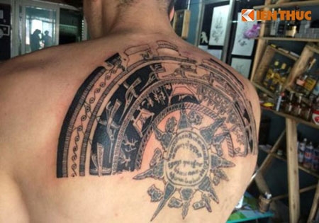 Hình xăm Trống Đồng có đường kính 50cm được anh Lâm xăm ròng rã trong 8 tiếng đồng hồ. |