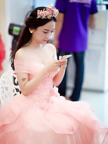 Trong bộ váy cưới phong cách công chúa, Thúy Vi khoe trọn vẻ đẹp thiếu nữ cùng hình xăm kim cương ở ngay cánh tay. Được biết, hình xăm này đã được Thúy Vi xăm từ khá lâu nhưng chưa có nhiều dịp để "khoe".