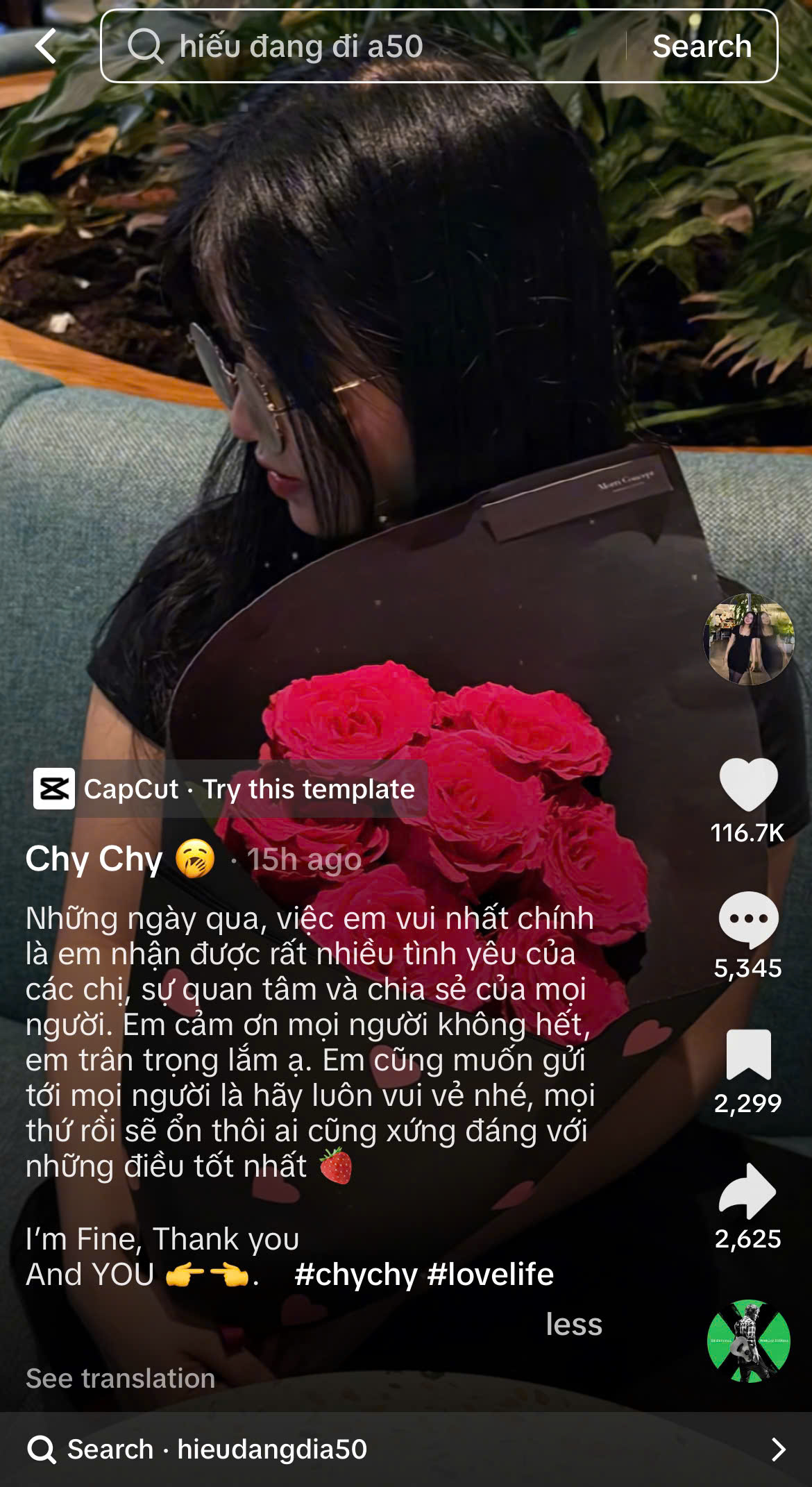 "Những ngày qua, việc em vui nhất chính là em nhận được rất nhiều tình yêu của các chị, sự quan tâm và chia sẻ của mọi người. Em cảm ơn mọi người không hết, em trân trọng lắm ạ. Em cũng muốn gửi tới mọi người là hãy luôn vui vẻ nhé, mọi thứ rồi sẽ ổn thôi ai cũng xứng đáng với những điều tốt nhất. I'm fine, thank you, and you".