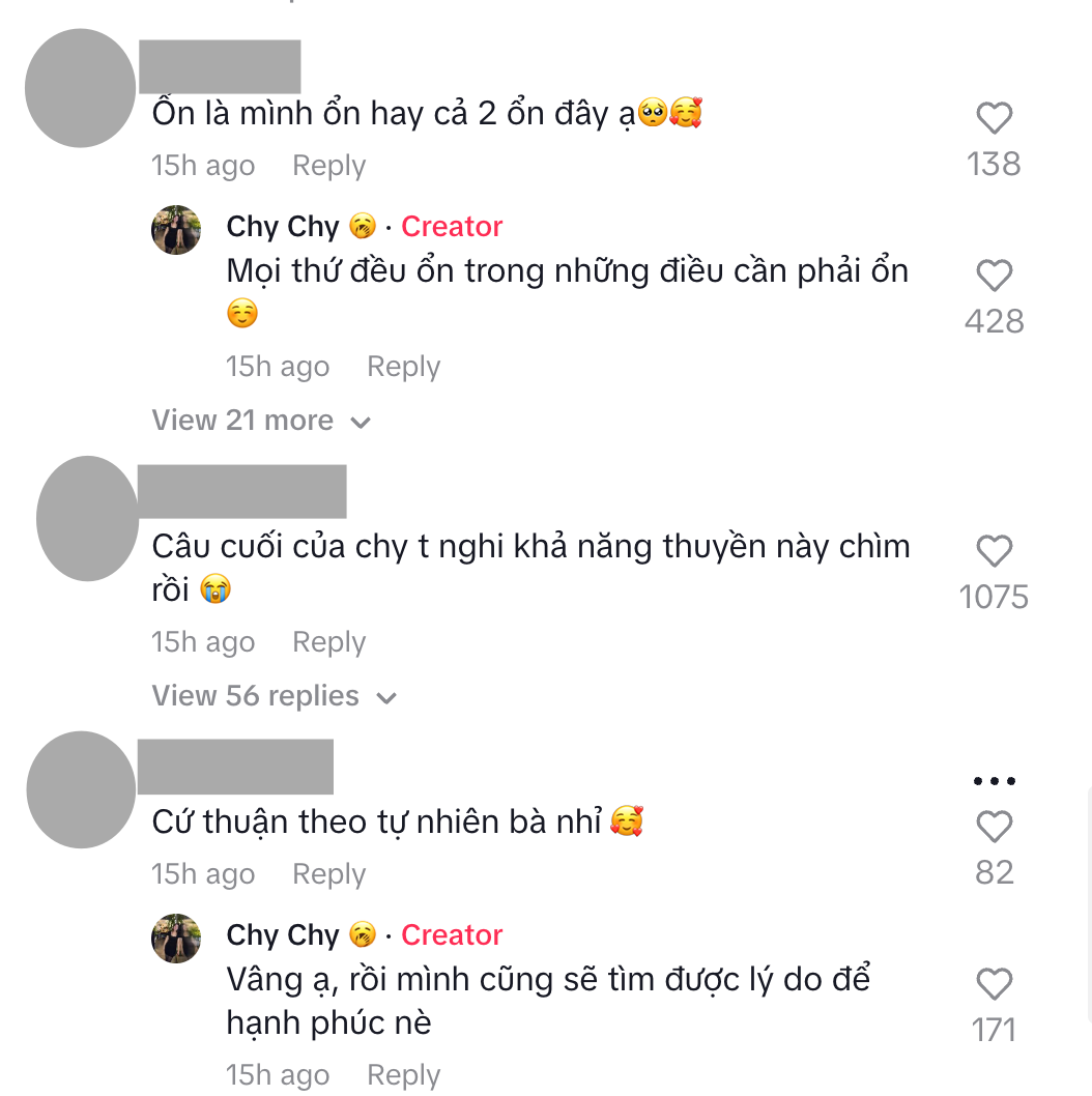 Ở dưới video, Chu Chy cũng cập nhật thêm về tình hình hiện tại của cả hai. "Mọi thứ đều ổn trong những điều cần phải ổn". Và khi có netizen khuyên nên để mọi thứ thuận theo tự nhiên, thì Linh Chi cũng đồng ý: "Vâng ạ, rồi mình cũng sẽ tìm được lý do để hạnh phúc nè".