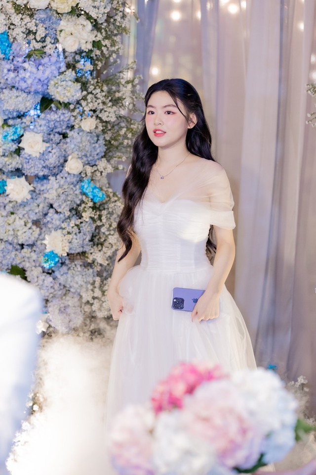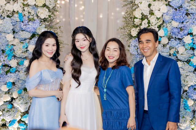 Buổi tiệc được tổ chức hoành tráng tại nhà hàng ở Quận 7 (TPHCM). Toàn bộ không gian trang trí bằng hoa tươi như hoa hồng, cẩm tú cầu, cúc hoạ mi... có tông màu chủ đạo là trắng và xanh dương. Với diện tích phủ hoa khá lớn, buổi tiệc dự đoán có khoảng hơn 100 khách mời tham dự.