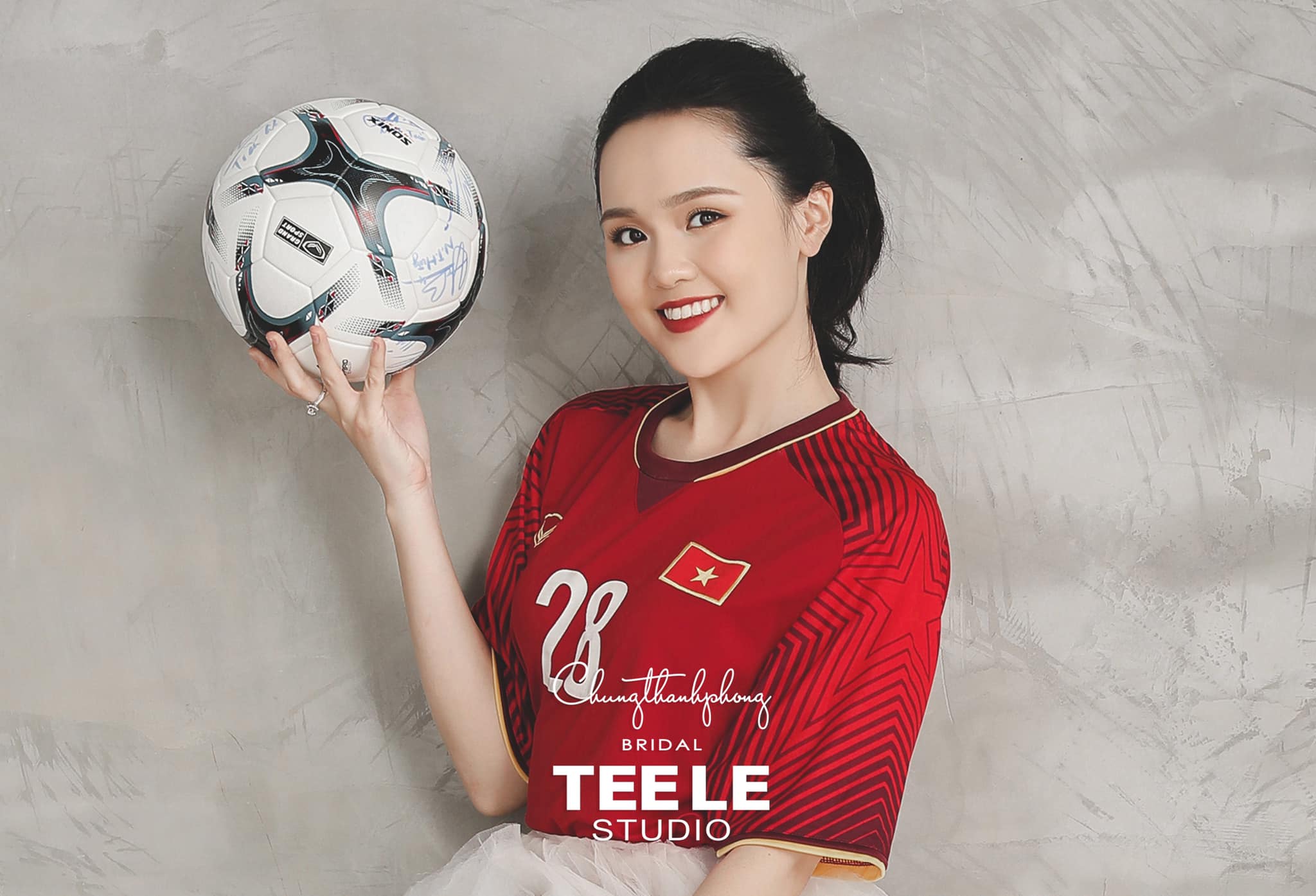 Trong hình cưới được tung ra lần này, vợ chồng Bùi Tiến Dũng diện áo đôi màu đỏ, mẫu áo đấu của đội tuyển Việt Nam khi dự Asian Cup 2019. Concept áo và bóng là phong cách khá quen và từng được nhiều cầu thủ bóng đá áp dụng khi chụp hình cưới. Ba bức hình được xếp theo chiều dọc, thể hiện quá trình làm quen, tìm hiểu, rồi hẹn hò của cặp đôi.