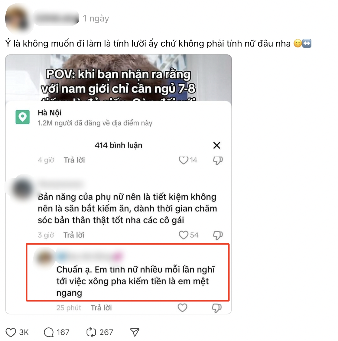 - "Không biết các bạn nữ thấy sao nhưng mỗi lần thấy cái văn "con gái không nên lao ra ngoài kiếm tiền mà nên chăm sóc bản thân mình" kèm gắn link mỹ phẩm, quần áo... mình thấy tủi thân thay cho các cô gái có gia đình khó khăn hoặc không có điều kiện kinh tế".