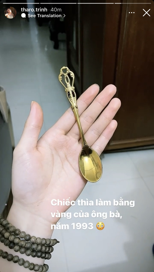 Và mới đây, Thảo Trinh tiếp tục chứng minh độ giàu có của gia đình chỉ bằng một vật dụng cực kì nhỏ bé. Đó chính là chiếc thìa của ông bà cô nàng. Đáng chú ý là chiếc thìa này được làm hoàn toàn bằng vàng và đã có tuổi đời 28 năm.
