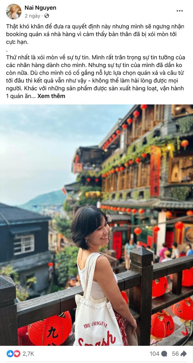 "Thật khó khăn để đưa ra quyết định này nhưng mình sẽ ngưng nhận booking quán xá nhà hàng vì cảm thấy bản thân đã bị xói mòn tới cực hạn.