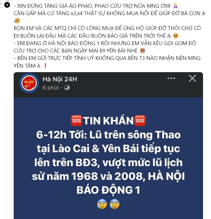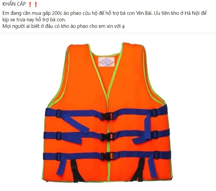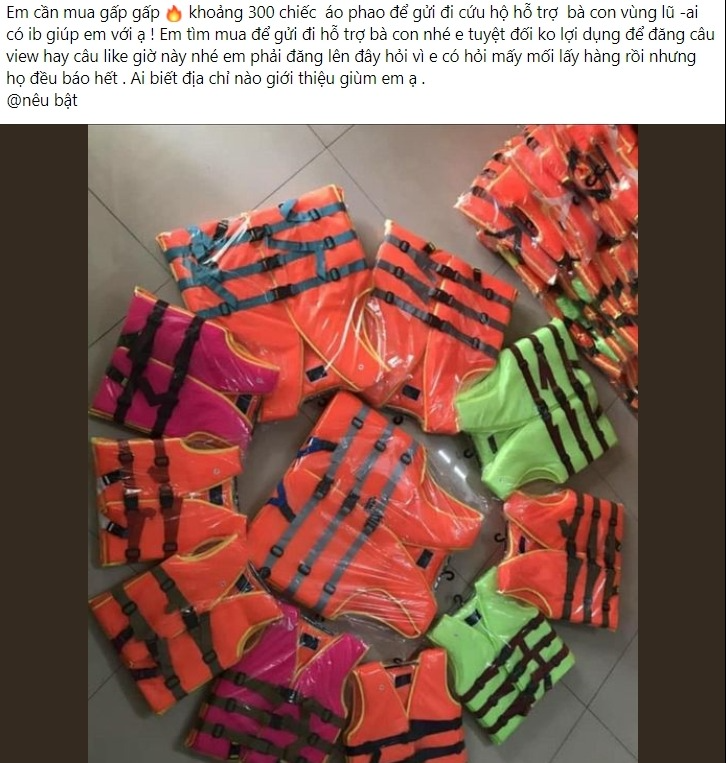 Ngay khi nước lũ bắt đầu kéo đến, mọi người đã bắt đầu tìm đặt áo pháo cứu hộ với số lượng lớn. Trên MXH, rất nhiều những bài đăng tải với nhu cầu muốn mua áo phao cứu hộ, không chỉ mua đơn lẻ lo cho gia đình của mình mà mọi người còn muốn đặt vài chục, vài trăm chiếc để hỗ trợ những nơi đang trực tiếp hứng chịu hậu quả của bão lũ.
