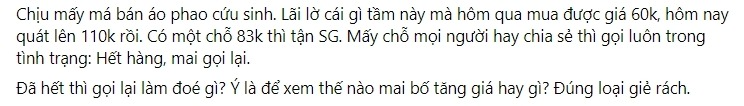 Một đơn vị thiện nguyện chia sẻ với chúng tôi, đơn vị này đặt mua áo phao với giá 150k/chiếc, một mức giá khá cao nhưng đang trong thời điểm "nước sôi lửa bỏng" như thế này, vẫn chấp nhận mua, nếu không mua thì lại không có áo gửi cho bà con vùng lũ.