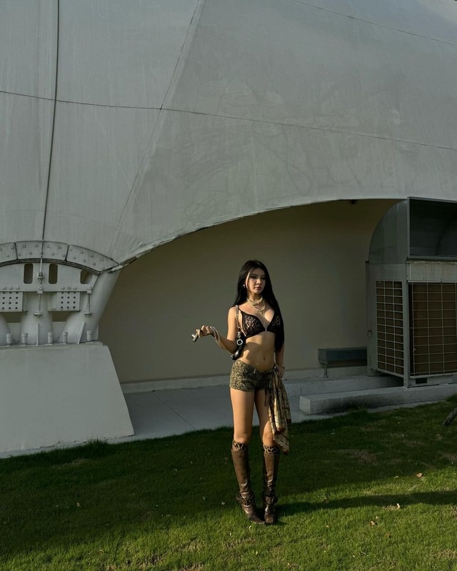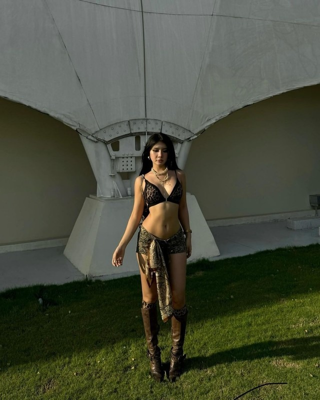 Mới đây trên trang cá nhân, Tiktoker Xuân Ca vừa đăng tải loạt ảnh mới trong thiết kế bikini 2 mảnh lấy màu nâu đen làm chủ đạo. Bộ đồ họa tiết da beo kết hợp cùng đôi boot nâu cao cổ, kèm theo phụ kiện như túi xách, khăn, kính mắt giúp tổng thể trang phục thêm "chiến".