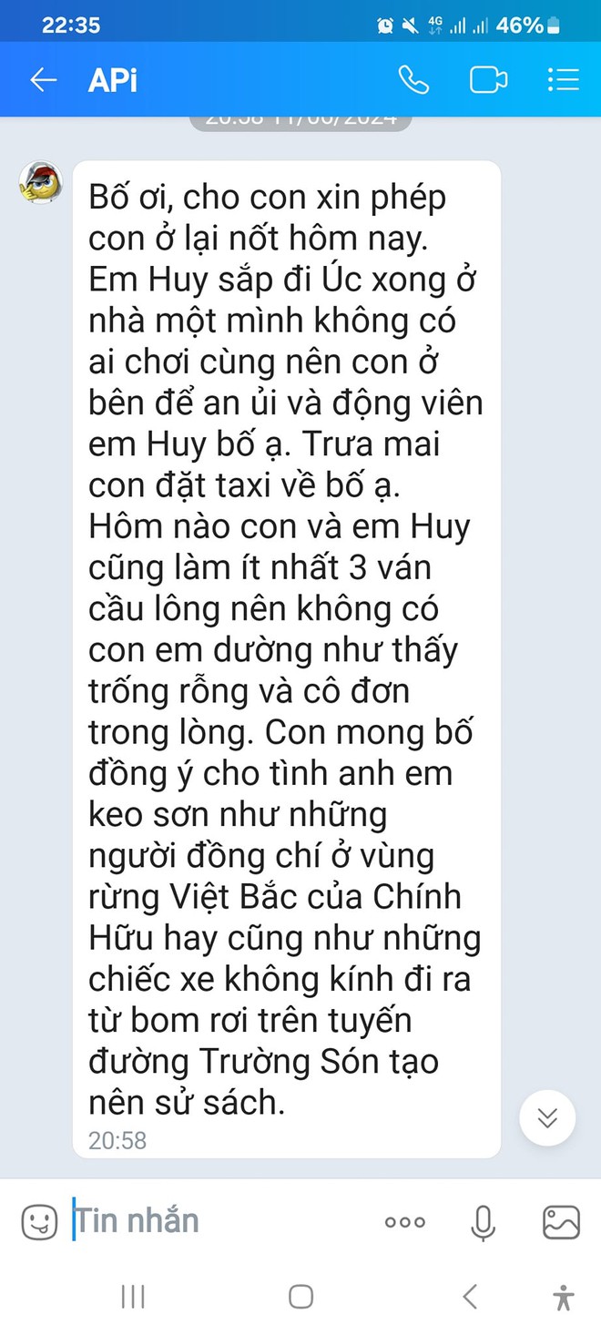 Trong tin nhắn, Bi Béo trình bày cậu em họ sắp đi Úc, rất cần người quan tâm, động viên. Cậu nhóc muốn xin bố ở lại chơi thêm 1 hôm, ngày mai sẽ đặt taxi về. Ngày nào hai anh em cũng chơi 3 ván cầu lông.