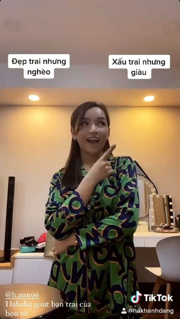 Ngoài ra, video còn có thêm hai tiêu chí: "Đẹp trai nhưng nghèo" và "Xấu trai nhưng giàu" lại gây chú ý hơn cả. Tưởng chừng sẽ thật đắn đo với lựa chọn này nhưng không, Khánh Hà ngay lập tức chỉ tay về phía "Xấu trai nhưng giàu" với biểu cảm tươi rói.