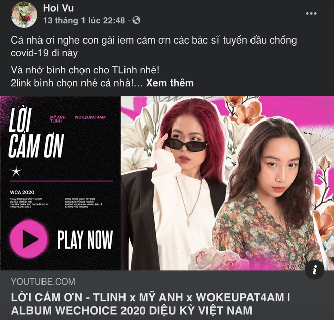 Không dừng lại ở đó, mẹ Tlinh còn cực kì ủng hộ con gái trên con đường nghệ thuật và mới nhất là đường đua WeChoice Awards 2020. Cô Hạnh thường xuyên share link và gọi vote cho con gái cưng.