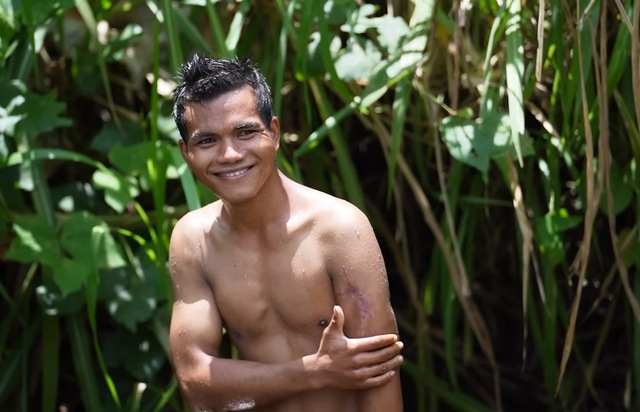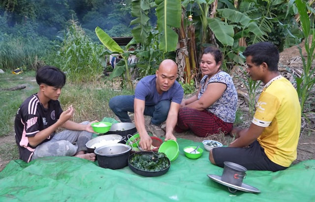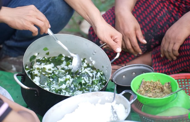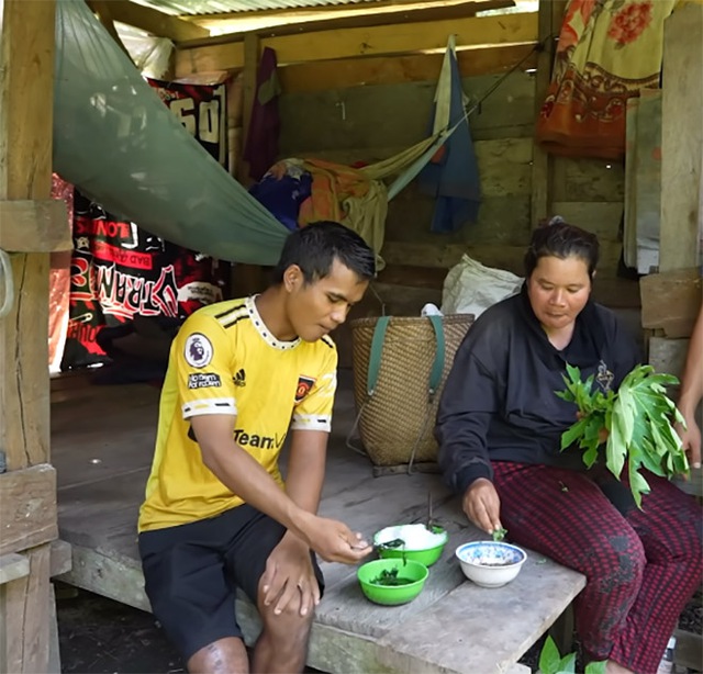Bữa ăn hàng ngày của hai vợ chồng chị Định rất đơn giản, chỉ có cơm trắng, cá khô giã với muối, một ít canh cho anh Triệu, còn chị ăn lá đu đủ sống. Hai vợ chồng ăn uống rất ngon miệng. Chị Định kể, chị ăn rất nhiều nên có được sức khỏe tốt. Mỗi khi vào rừng, người phụ nữ này leo phăm phăm khiến nhiều người bất ngờ.