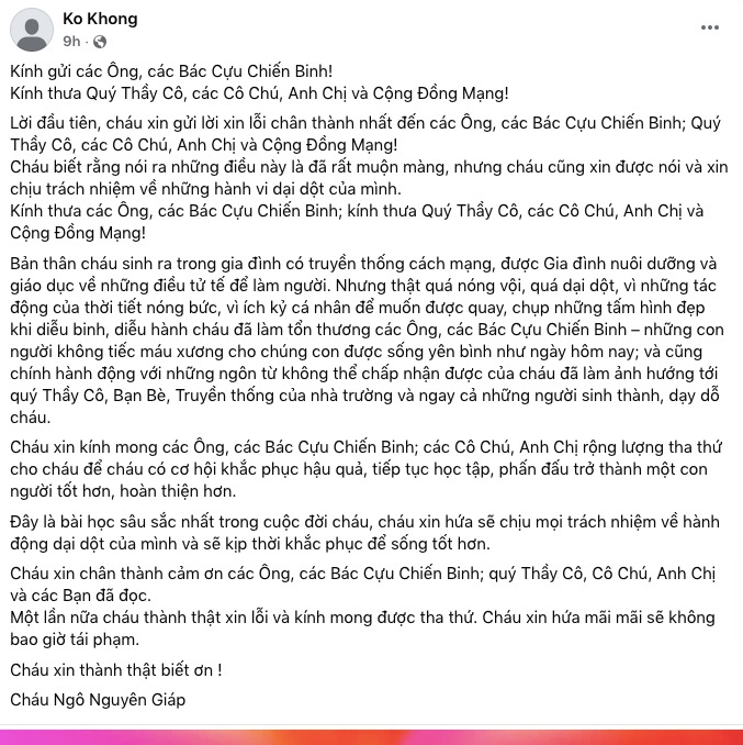 “Cháu xin gửi lời xin lỗi chân thành nhất đến các Ông, các Bác Cựu Chiến Binh… Vì những tác động của thời tiết nóng bức, vì ích kỷ cá nhân để muốn được quay, chụp những tấm hình đẹp khi diễu binh… Cháu đã làm tổn thương đến những con người không tiếc máu xương để chúng cháu có cuộc sống yên bình hôm nay", trích đoạn nội dung bài đăng.