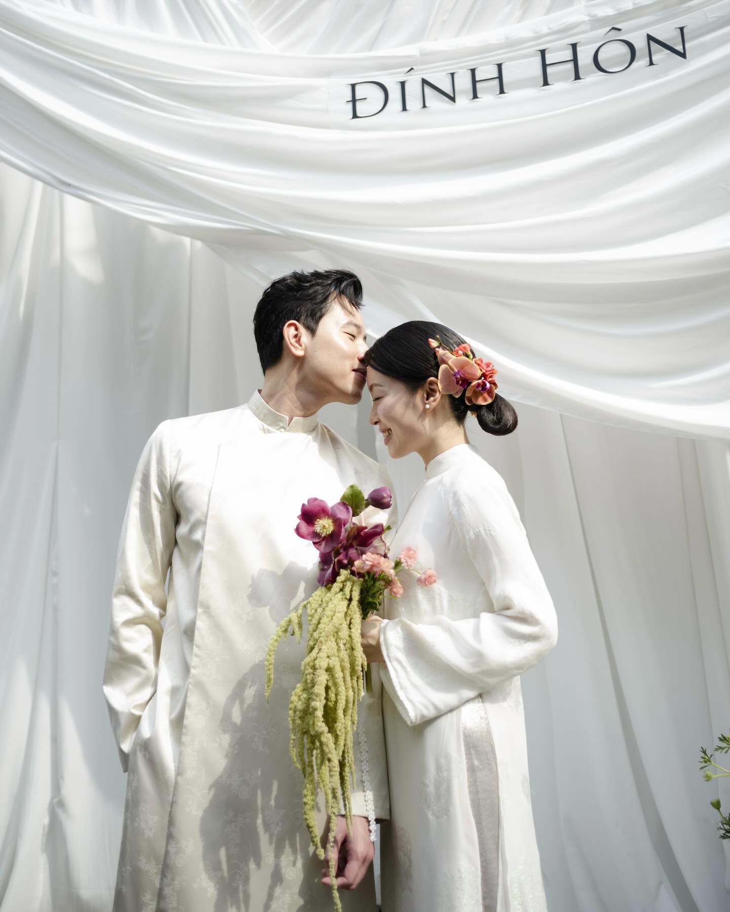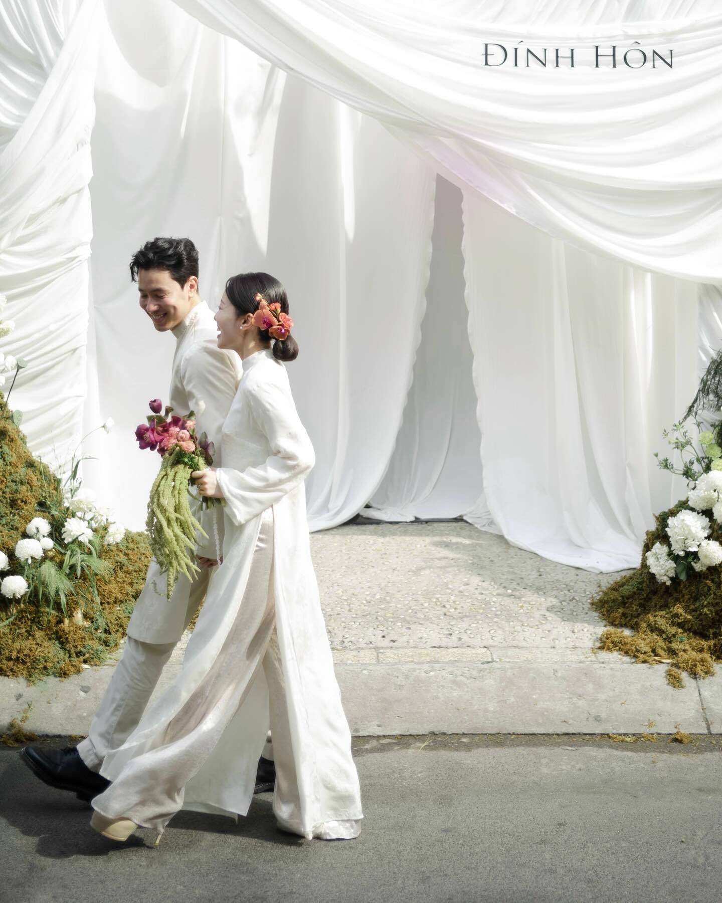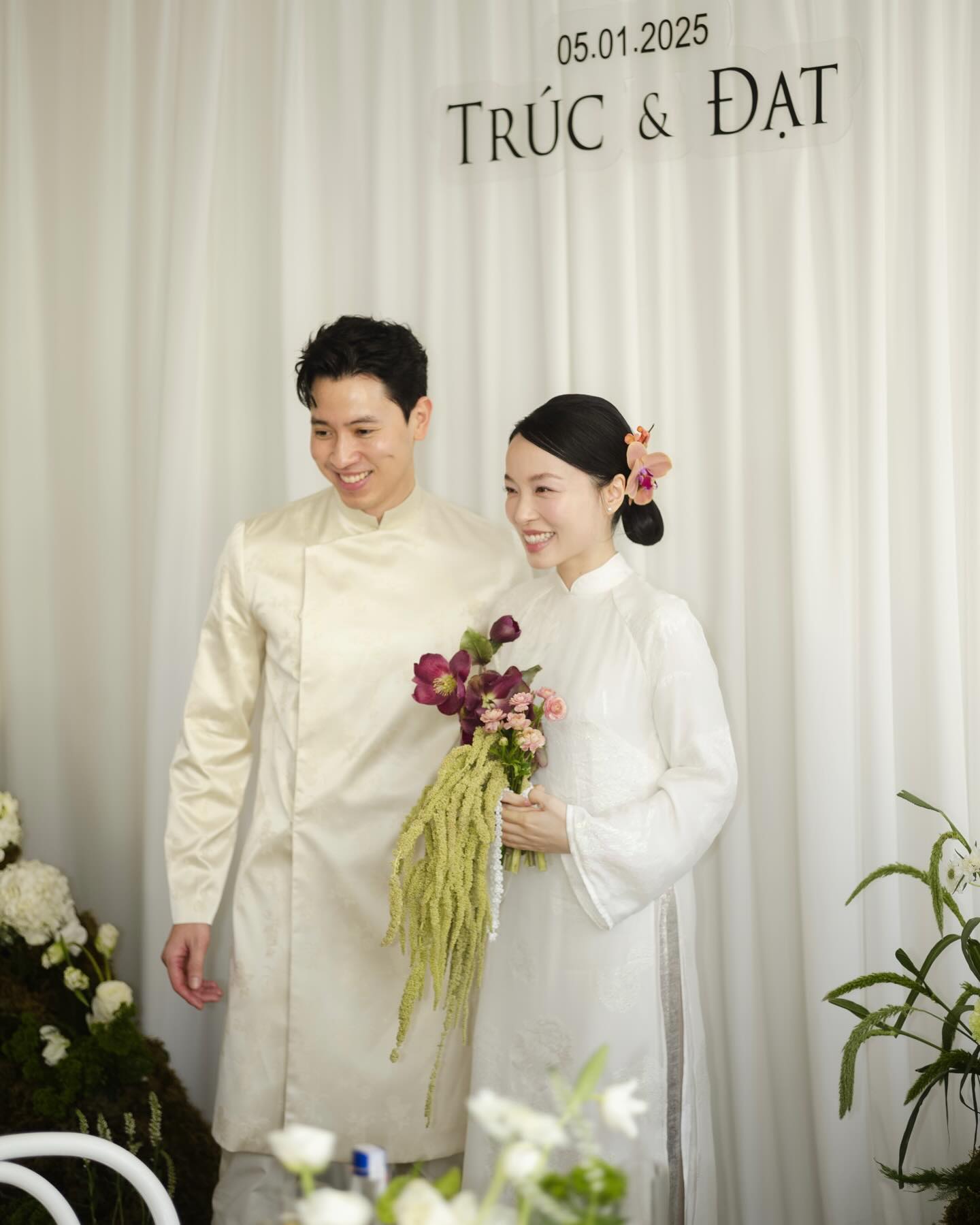 Trong loạt ảnh này, Quang Đạt và Hà Trúc mặc áo dài trắng đơn giản nhưng vẫn rất thanh lịch, trang nhã. Về phần chú rể, Quang Đạt vẫn giữ vững phong độ “cơ trưởng điển trai nhất Việt Nam”, cực kỳ bảnh bao. Còn Hà Trúc lại là cô gái xinh đẹp và hạnh phúc nhất dù chỉ trang điểm nhẹ nhàng, búi tóc thấp và cài hoa lan phía sau.