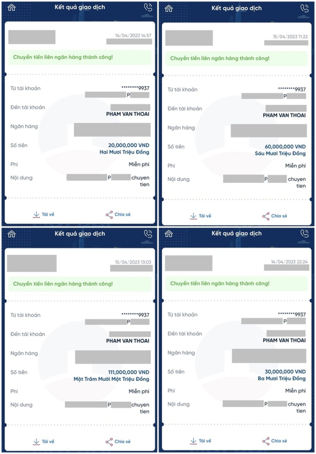Số tiền được chia thành 4 lần chuyển khoản: 20, 30, 60 và 111 triệu đồng ngày 14 - 15/4, thừa 1 triệu đồng đã được chuyển khoản trả lại. Nhưng quá trình làm việc sau đó giữa 2 bên không được suôn sẻ như mong đợi.