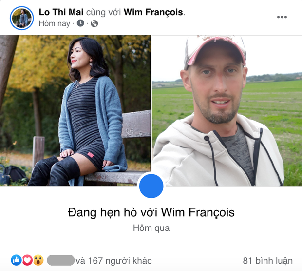 Và mới đây, dân mạng được phen choáng nhẹ khi Lò Thị Mai công khai tình mới chỉ sau 1 tháng chia tay bạn trai CEO. Người mới của cô tên là Wim Francois cả 2 đều đã cập nhật trạng thái hẹn hò trên Facebook.
