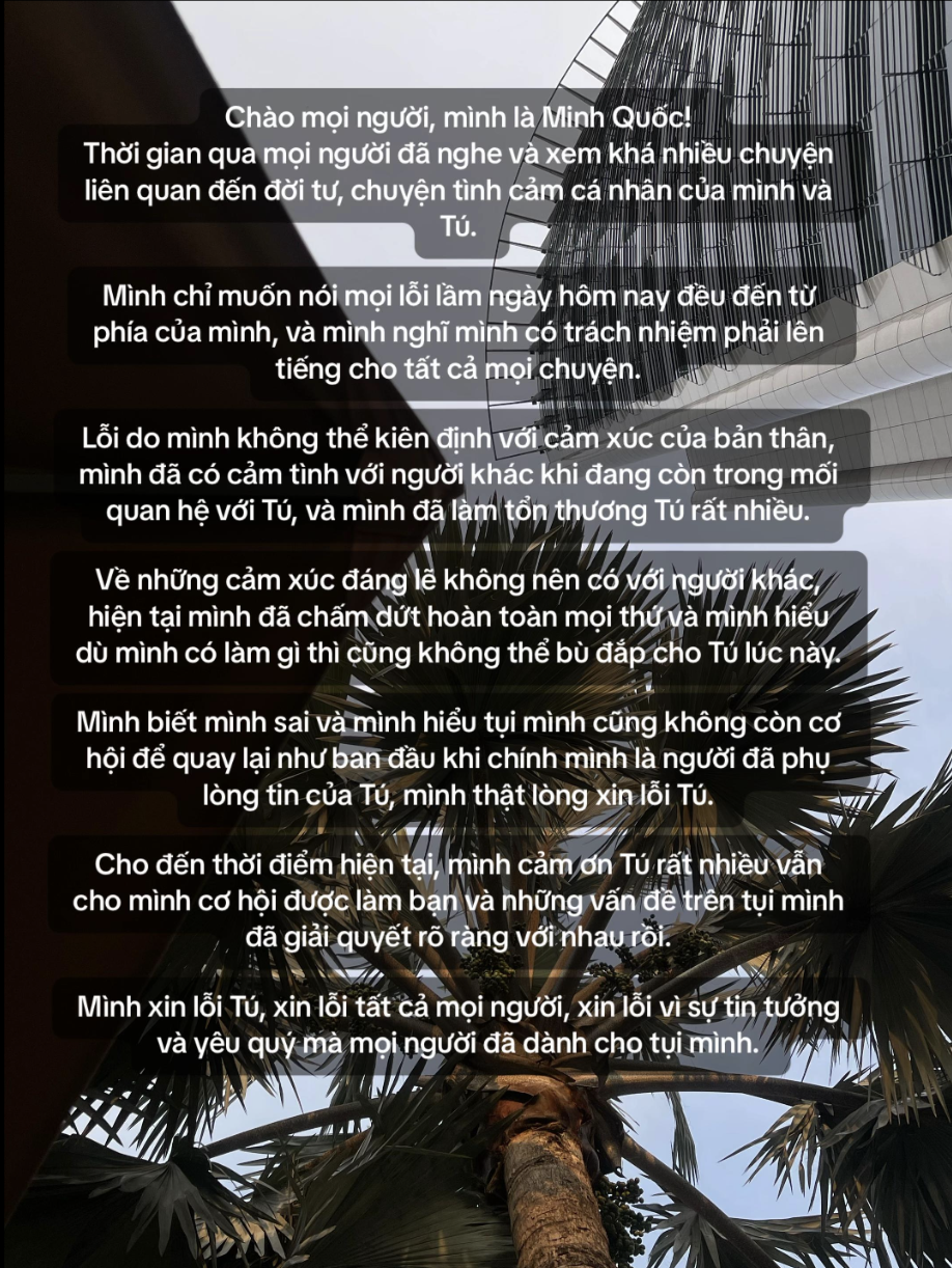 Theo đó Minh Quốc thừa nhận mọi lỗi lầm, cụ thể là “không thể kiên định với cảm xúc của bản thân, có cảm tình với người khác khi đang còn trong mối quan hệ với Tú và mình đã làm tổn thương Tú rất nhiều”.