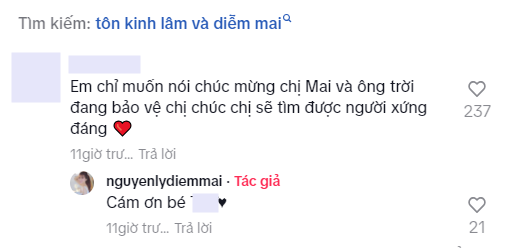 Trong lúc người yêu cũ cưới hỏi, không ít netizen tìm đến Nguyễn Lý Diễm Mai và gửi lời an ủi. Đáng nói, có một bình luận được chính cô gửi lời cảm ơn có nội dung: “Em chỉ muốn nói chúc mừng chị Mai và ông trời đang bảo vệ chị. Chúc chị sẽ tìm được người xứng đáng”.