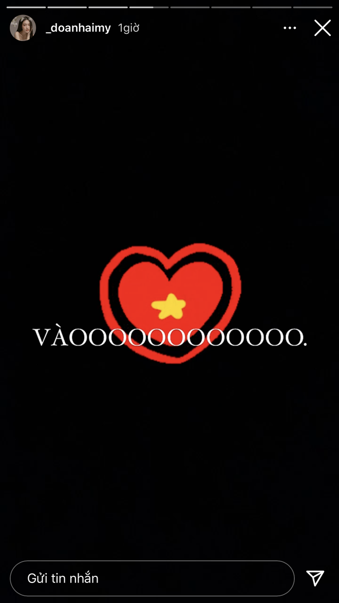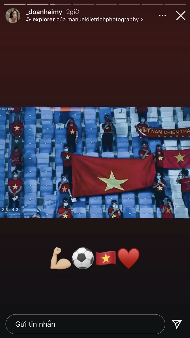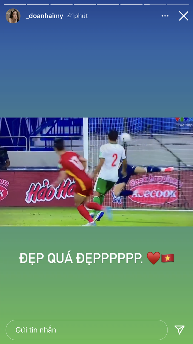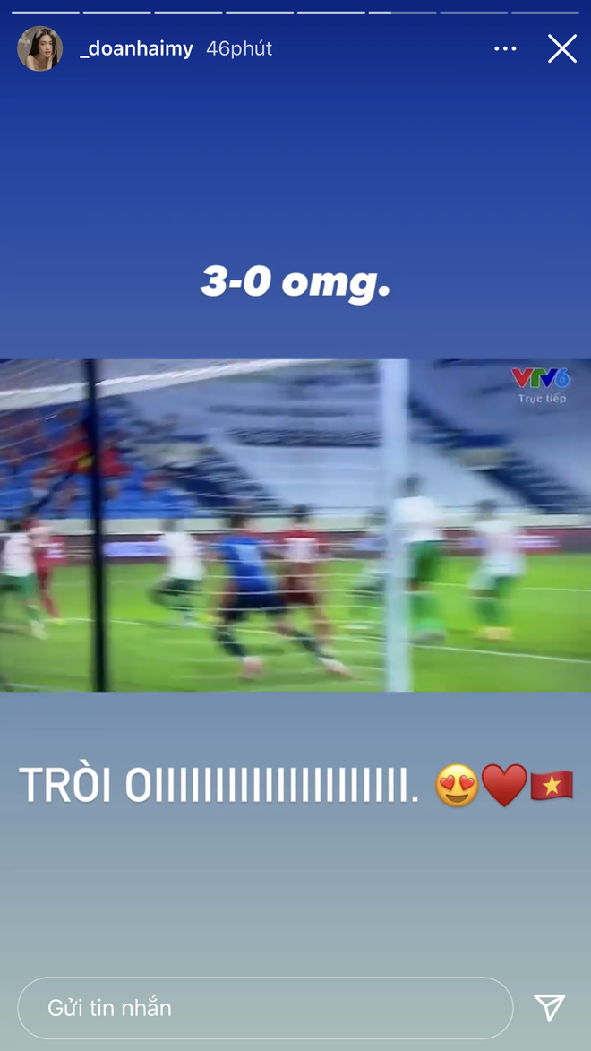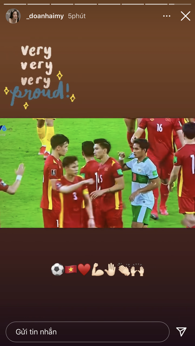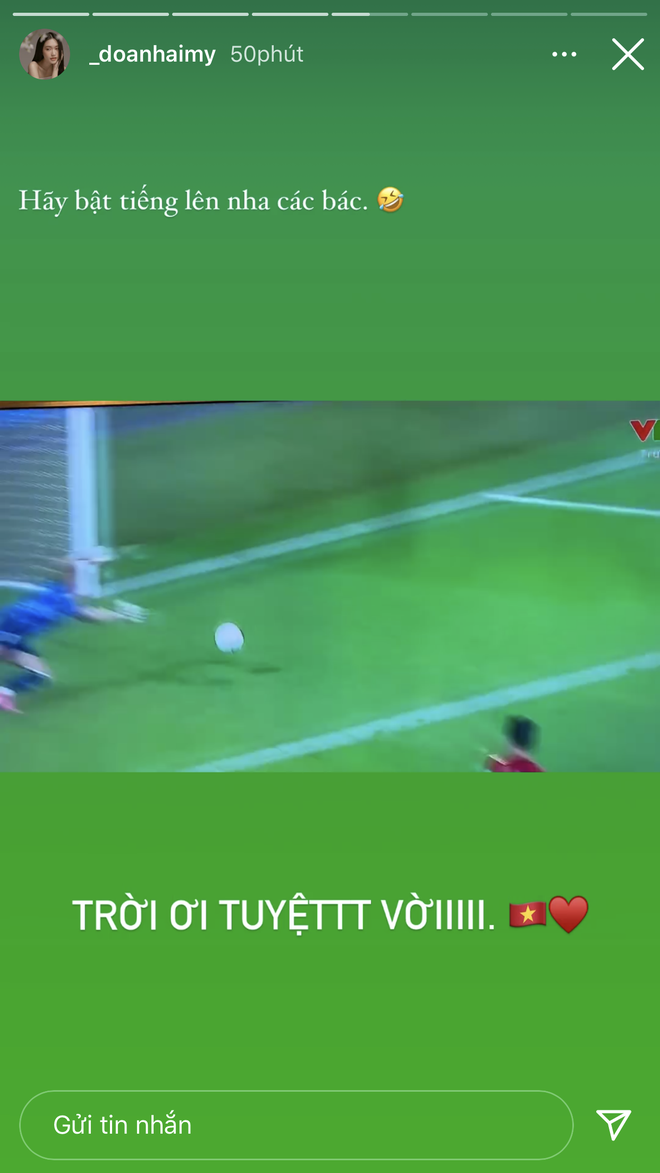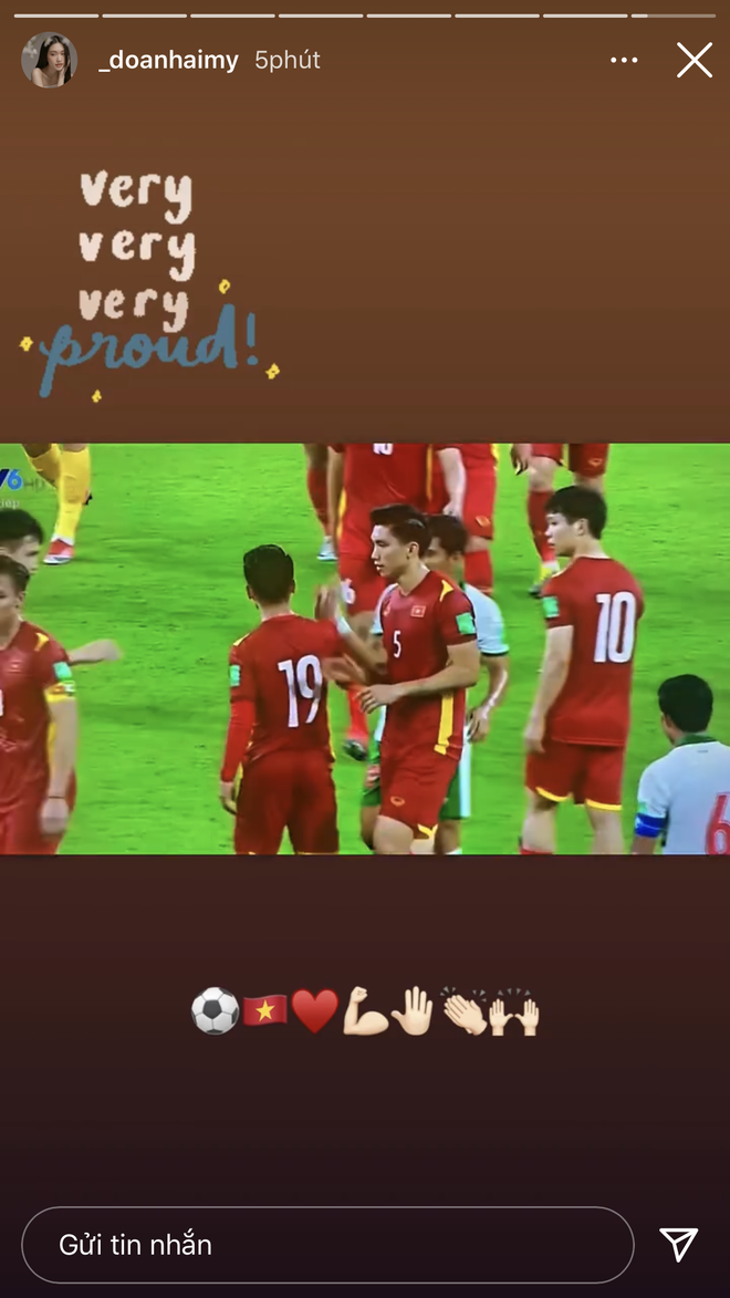 Trước đó, Doãn Hải My cũng đăng story cho biết mình theo dõi trận đấu ngay từ đầu và thường xuyên cập nhật tỷ số trận đấu. Cô nàng để lại rất nhiều icon bày tỏ cảm xúc sau mỗi bàn thắng.