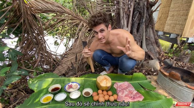Như một người dân bản địa, Dustin chuẩn bị đầy đủ nguyên liệu cho món thịt kho trứng, bao gồm: 2 kg thịt lợn, trứng gà, nước dừa cùng các loại gia vị. Đặc biệt, anh chàng không thái thịt bằng dao mà đã "chơi lớn" dùng ngay cây rìu mới mua để làm. Pha test hàng mới có vẻ không vui cho lắm khi anh nhìn thấy những vết nứt trên chiếc thớt gỗ.