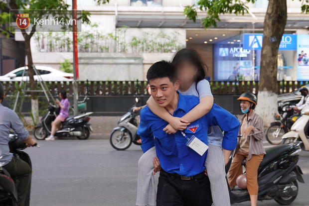 "Nhiệm vụ của chúng mình là giữ cho kỳ thi diễn ra suôn sẻ bằng cách mang nước cho thí sinh và phụ huynh, hướng dẫn sĩ tử đến điểm thi, dọn dẹp đường... Mình cõng em nữ bởi bạn đó đang bị gãy chân sau khi đi chụp kỷ yếu về. Mình cảm thấy rất vui khi có thể góp chút công sức hỗ trợ mọi người và sĩ tử thi tốt hơn", anh chàng chia sẻ thêm.