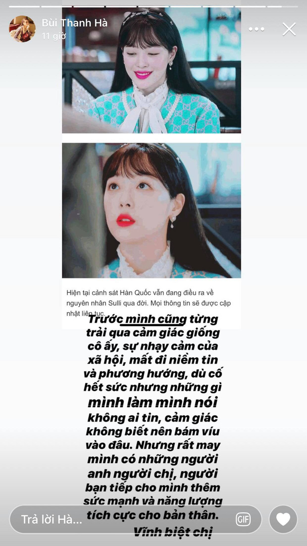 Bên cạnh Trâm Anh, nhiều hot girl khác cũng đã chia sẻ cảm xúc đau lòng vì sự ra đi đột ngột của Sulli. Ai nấy đều tiếc cho một nhan sắc, một tài năng, một sự rực rỡ của cô gái 25 tuổi ấy.